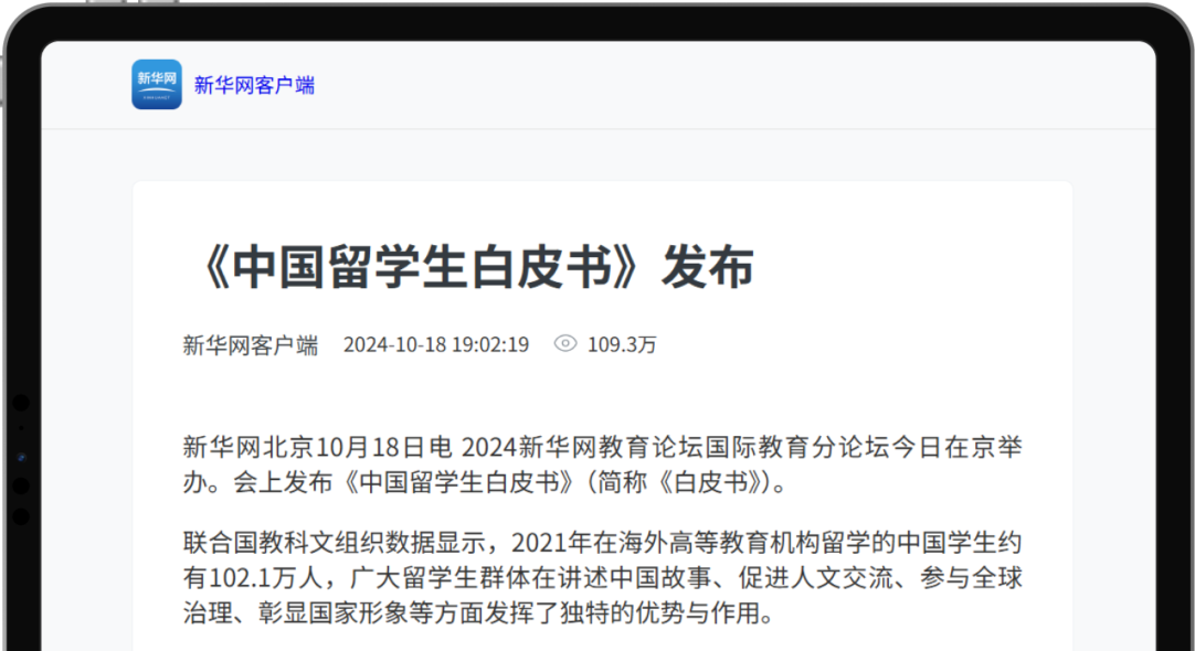 新華網發布《中國留學生白皮書》,瀏覽量突破百萬,獲各大媒體轉載熱追。