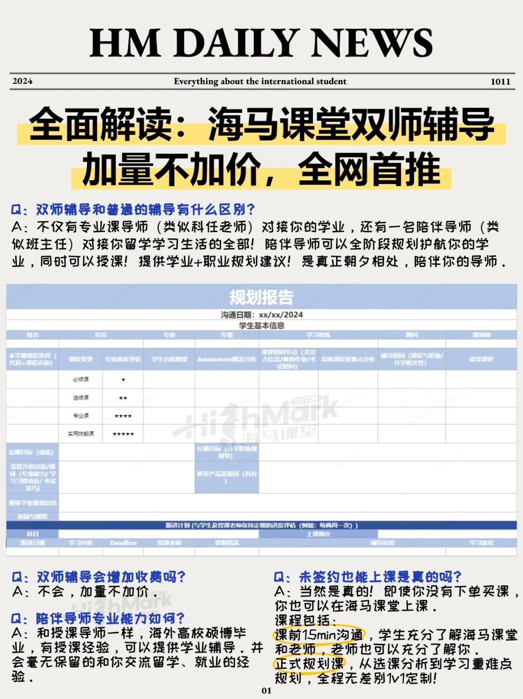未簽約也能上課,課程包括課前 15min 溝通,讓學生和老師充分了解彼此,還有正式規劃課,從選課分析到學習重難點規劃,全程無差別 1V1 定制。