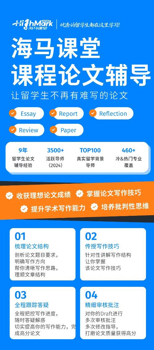 你在寫論文時完全沒思路嗎?別擔心,海馬課堂來了!海馬課堂擁有九年論文輔導經驗,團隊均是海外名校碩博導師,幫助你從選題到寫作全程把控。在輔導過程中,導師會根據學生基礎情況定制輔導方案,梳理選題和寫作思路,建立大綱,制定專屬學習計劃,助你突破寫作瓶頸。讓你寫出完美論文。還等什么?趕緊行動起來吧!