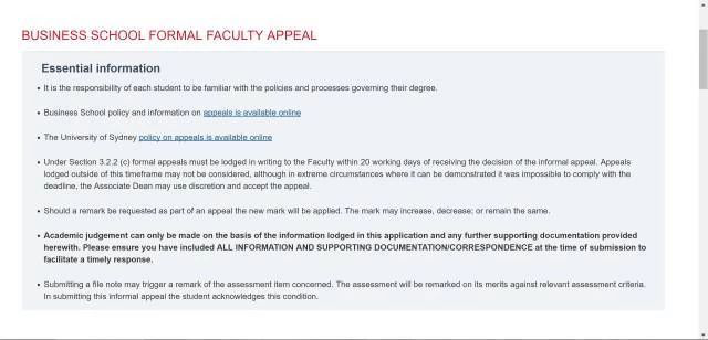 學(xué)生可就“非正式申訴階段”沒有解決的問題,向faculty提出進(jìn)一步申訴。該階段要求學(xué)生在非正式投訴最終結(jié)果出來的20個(gè)工作日內(nèi)填寫Formal Appeal From并提交給Student Information Office繼續(xù)申訴。一般遞交申訴的在10個(gè)工作日內(nèi)會收到來自Dean給出的Written Decision。