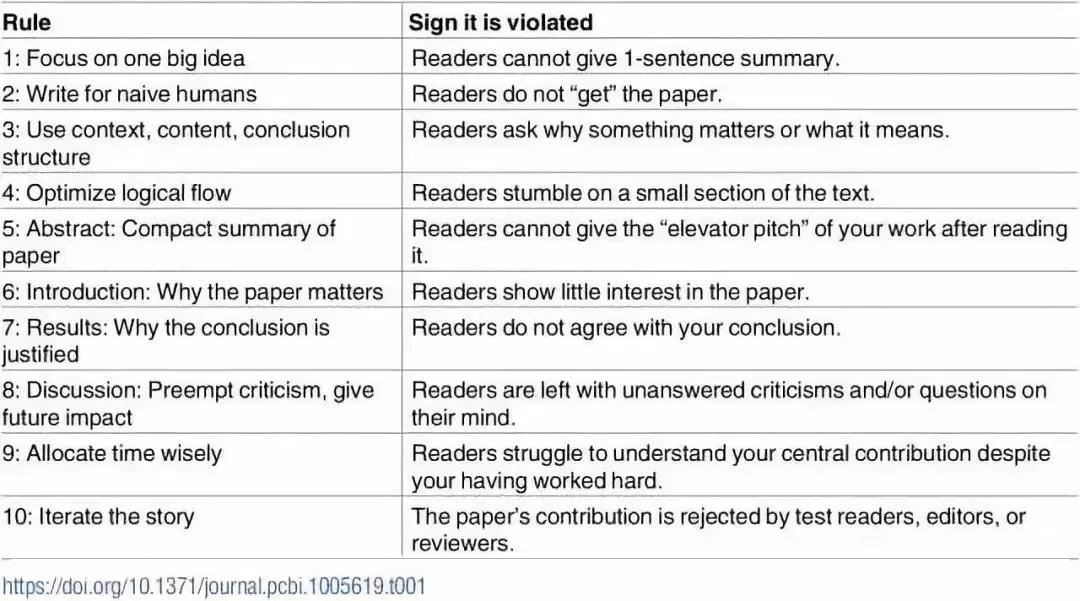 作為一個(gè)作者,如果你不能夠在幾分鐘之內(nèi)向你的同事描述出論文的整體大綱,那么很明顯讀者也無(wú)法做到。你需要進(jìn)一步提煉你的故事。找尋到此類(lèi)違反優(yōu)秀寫(xiě)作的行為對(duì)從各個(gè)層次提高論文質(zhì)量十分有益。