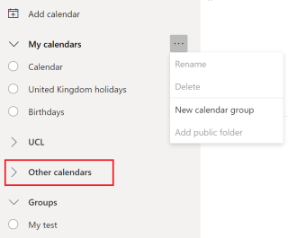 請?jiān)贠utlook Office 365中檢查是否存在一個(gè)名為“Other calendars”的日歷組。如果沒有,你可以通過“New calendar group”(新建日歷組)創(chuàng)建一個(gè)。