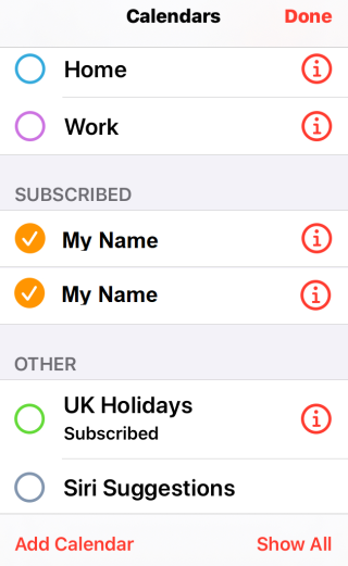 前往“設(shè)置”→“密碼與賬戶”→“賬戶”→“已訂閱的日歷”,選擇“My Name”日歷,
