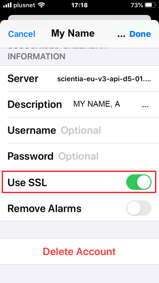確保“Server”字段是“scientia-eu-..”,然后開啟“使用SSL(Use SSL)”選項(xiàng)(滑動(dòng)按鈕為綠色)。